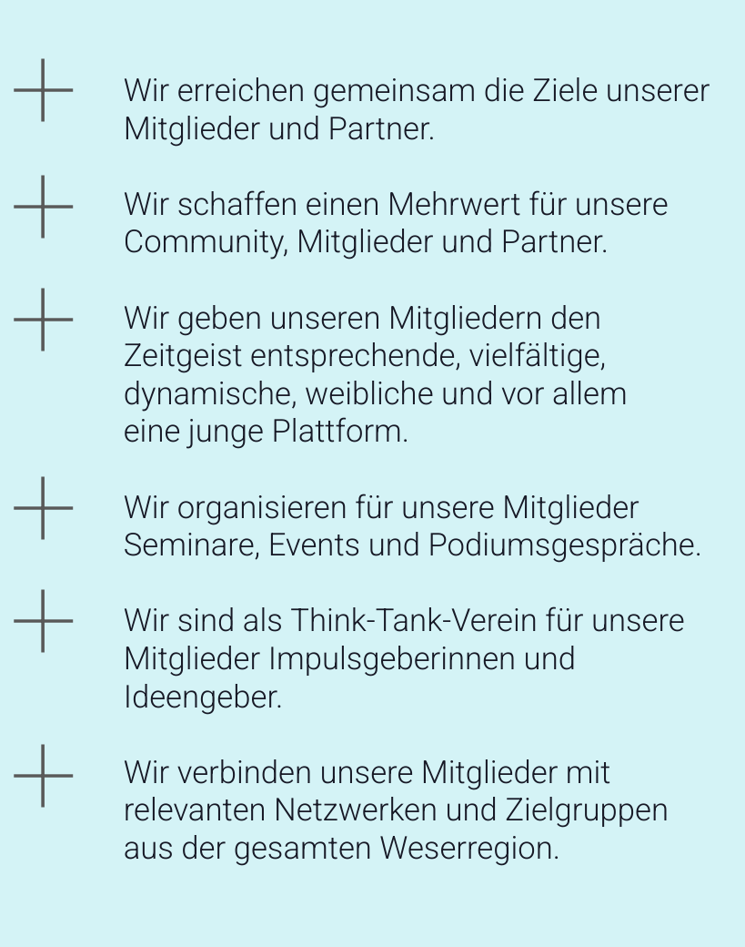 Kulturwandel, Frauen in Führungspostionen und die Gewinnung junger Talente für die ländliche Region sind Herausforderungen. Damit ländliche Regionen und Unternehmen nicht auf der Strecke bleiben, bauen wir ein solides Fundament mit ideellen Werten. Wir stärken das positive Mindset-Commitment bei unseren Mitgliedern und bilden eine langfristige Imagestrategie mit aussichtsreichen Perspektivenwechsel. Unsere Mitgliedschaft und Kooperationen sind langfristig ausgelegt. Unsere Mitglieder und Partner erhalten durch das Weserwirtschaftsforum zusätzliche nachhaltige Benefits.